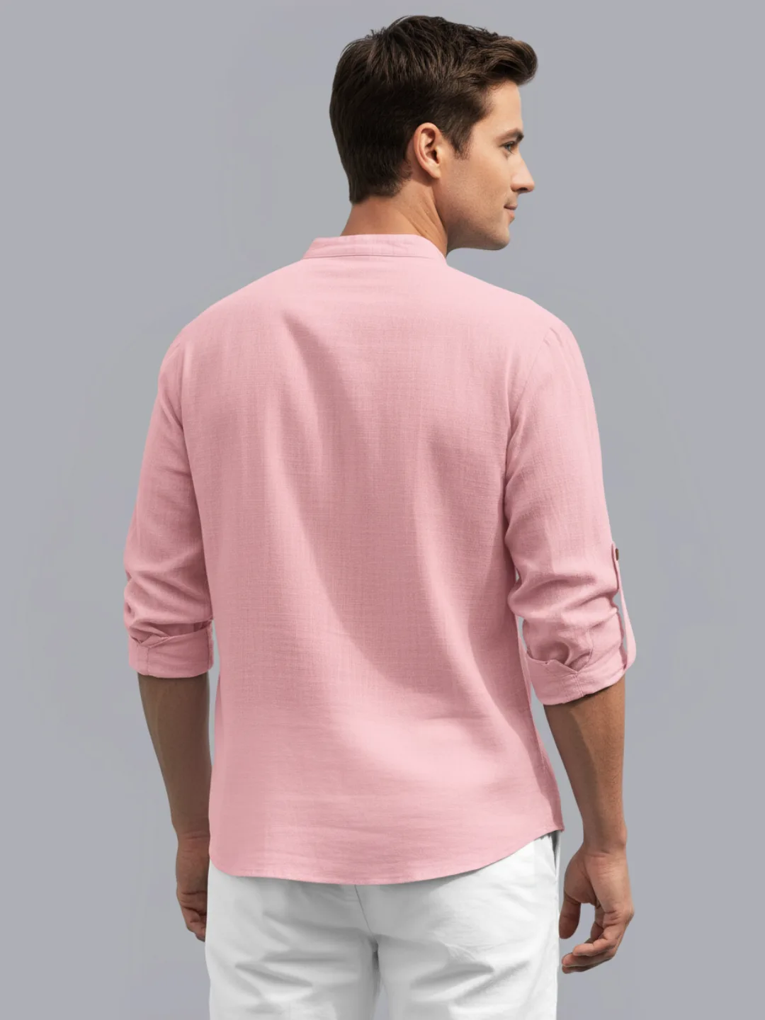 Complemented by antique buttons, this champagne beige short kurta boasts a timeless elegance with its textured fabric and bandhgala collar. Perfect for semi-formal events, pair it with tailored trousers and loafers for a refined ensemble.