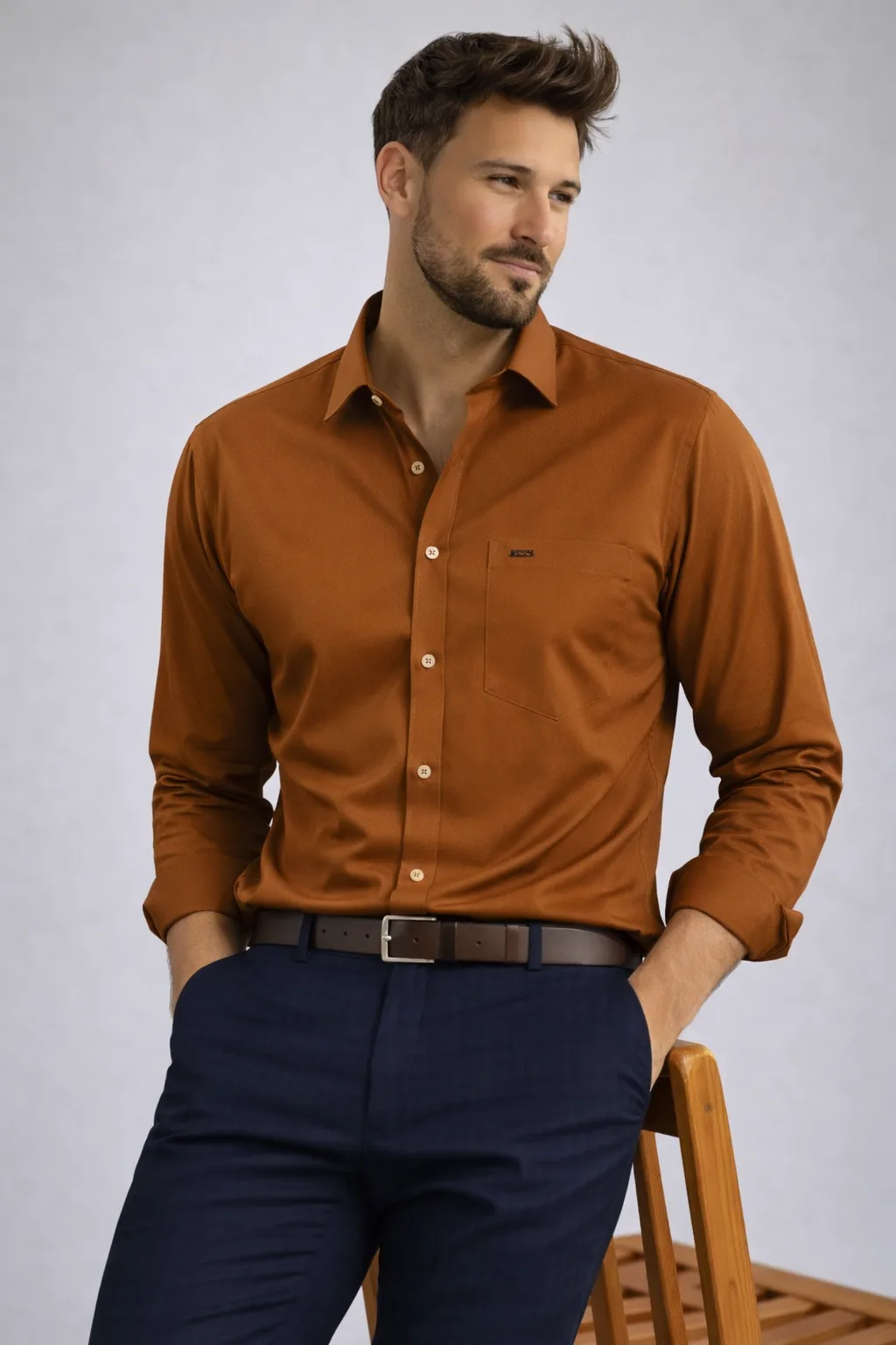A refined staple with a touch of lustre, this shirt lends effortless polish to smart-casual edits. Designed with a crisp collar, full sleeves with cuffs, its smooth sateen weave offers a soft hand feel and subtle sheen. Finished in a contemporary fit and a front patch pocket for understated detail.